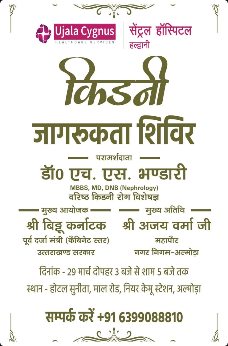 अल्मोड़ा:::- पूर्व दर्जा मंत्री बिट्टू कर्नाटक आगामी 29 मार्च को दोपहर 3 बजे से शाम 5 बजे तक होटल सुनीता निकट केएमओयू स्टेशन अल्मोड़ा में उजाला हास्पिटल हल्द्वानी (सेंट्रल हॉस्पिटल)के साथ किडनी जागरूकता शिविर का आयोजन करेंगे। इस शिविर में वरिष्ठ किडनी रोग विशेषज्ञ डॉक्टर एच एस भंडारी किडनी से जुड़ी समस्याओं एवं उनके बचाव के लिए परामर्श देते हुए लोगों को जागरूक करने का कार्य करेंगे।इस जागरूकता शिविर में अल्मोड़ा नगर निगम के महापौर अजय वर्मा मुख्य अतिथि के रूप में उपस्थित रहेंगे। पूर्व दर्जा मंत्री बिट्टू कर्नाटक ने बताया कि वर्तमान में खानपान एवं जीवन शैली में परिवर्तन आने से किडनी से जुड़ी समस्याएं बढ़ने लगी है ऐसे में बेहद आवश्यक है कि आमजन में अपने स्वास्थ्य एवं किडनी को लेकर सही जानकारी हो,उन्होंने कहा कि किस तरीके से आज की जीवन शैली में किडनी के रोगों से बचा जा सकता है इसको लेकर के इस किडनी जागरूकता शिविर का आयोजन किया जा रहा है। श्री कर्नाटक कहा कि 29 मार्च को आयोजित इस शिविर में अल्मोड़ा नगर निगम के समस्त पार्षदगण,समस्त पत्रकार बन्धु एवं आम जनता अपनी भागीदारी सुनिश्चित करेगी। उन्होंने कहा कि इसके बाद चरणबद्ध तरीके से वे अल्मोड़ा , जागेश्वर, रानीखेत , द्वाराहाट विधानसभाओं के नगर एवं दूरस्थ गांवों तक स्वास्थ्य संबंधी शिविरों का आयोजन कर जरूरत मंद लोगों तक पहुंचने का काम करैंगे। श्री कर्नाटक ने आमजन से यह अपील की है कि इस किडनी जागरूकता शिविर में उपस्थित होकर इस शिविर से किडनी समस्या संबंधित समस्त जानकारियां एवं उनके बचाव का परामर्श वरिष्ठ किडनी रोग विशेषज्ञ से ले कर अपने आप को स्वस्थ्य रखने की इस मुहिम का हिस्सा बन गंभीर बीमारियों से बचाव के आसान रास्तों में चलने का कार्य करेंगे।