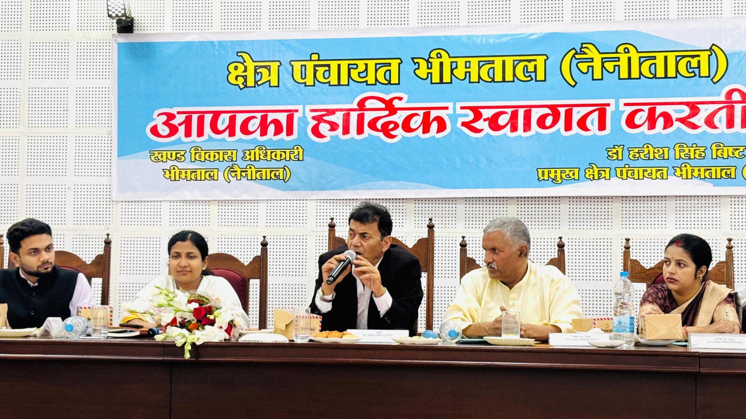 भीमताल :::- भीमताल ब्लॉक सभागार में बृहस्पतिवार को क्षेत्र पंचायत की प्रथम बैठक ब्लॉक प्रमुख डॉ. हरीश सिंह बिष्ट की अध्यक्षता में आयोजित की गई। बैठक का शुभारंभ ब्लॉक प्रमुख डॉo हरीश सिंह बिष्ट, मुख्य विकास अधिकारी अनामिका ज्येष्ठ प्रमुख, कनिष्ठ प्रमुख, खण्ड विकास अधिकारी ने सामूहिक रूप से दीप प्रज्वलित कर शुभारंभ किया । प्रथम बैठक में सर्वप्रथम जनप्रतिनिधियों एवं विभागीय अधिकारियों ने अपना परिचय दिया।बैठक में क्षेत्र पंचायत सदस्य और ग्राम प्रधानों ने क्षेत्र की समस्याओं को उठाया। जिसपर विभागीय अधिकारियों द्वारा समस्याओं पर त्वरित कार्यवाही का आश्वासन दिया।