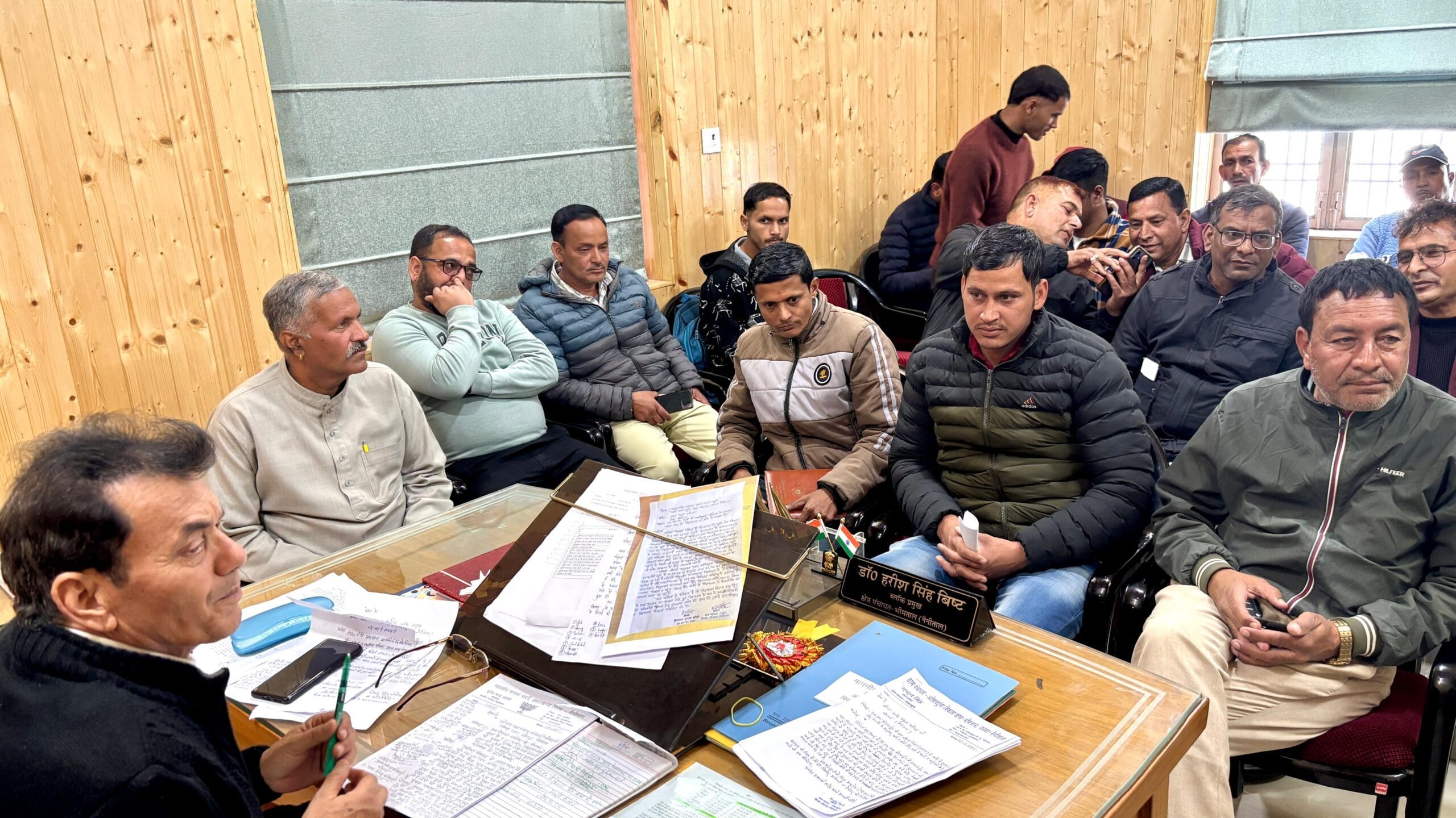 भीमताल:::- ब्लॉक प्रमुख डॉ. हरीश सिंह बिष्ट ने जनसंवाद में जनसमस्याओं को सुन मौके पर ही अधिकारियों को निस्तारण के निर्देश दिए। प्रमुख ने कहा ग्रामीणों की समस्याएं निरंतर रहती हैं हमारा प्रयास रहता हैं गति पूर्वक सभी समस्याओं का निस्तारण किया जाए। ओखलढुंगा के ग्राम प्रधान द्वारा जल जीवन मिशन में झूलते पाइप,अनियमितताओं को लेकर अवगत कराया जिस पर प्रमुख ने जल जीवन मिशन जल संस्थान, जल निगम के अधिकारियों को गुणवत्ता पूर्वक कार्य करने के निर्देश दिए हैं। और स्थलीय निरीक्षण भी शीघ्र किया जाएगा। राशन कार्ड से सम्बंधित कई ग्रामीण नाम जुड़वाने के लिए कार्यालय पहुंचे प्रमुख ने खाद्य पूर्ति विभाग को न्याय पंचायत स्तर पर शिविर लगाकर जन समस्याओं को निस्तारण करने के निर्देश दिए हैं। विभागीय पंचायत एवं विकास के सभी कार्मिकों को तीव्र गति से गुणवत्ता युक्त कार्य समय पर पूर्व करने के निर्देश दिए। इसके साथ ही कृषि, पशुपालक , विद्युत मनरेगा के मुद्दे छाए रहे इस दौरान ज्येष्ठ प्रमुख उमेश पलड़िया ग्राम प्रधान नंदन बोरा, जितेन्द्र चनौतिया,विक्रम सम्मल, धर्मेन्द्र शर्मा, नवीन पांडे , ईश्वरी दत्त, कृष्ण पलड़िया,तारा नवीन क्वीरा, कुंदन जीना बीडीओ हर्षित गर्ग, प्रदीप पंत, भूपाल बिष्ट सहित अन्य जनप्रतिनिधि ग्रामीण विभागीय अधिकारी कर्मचारी मौजूद रहे।
