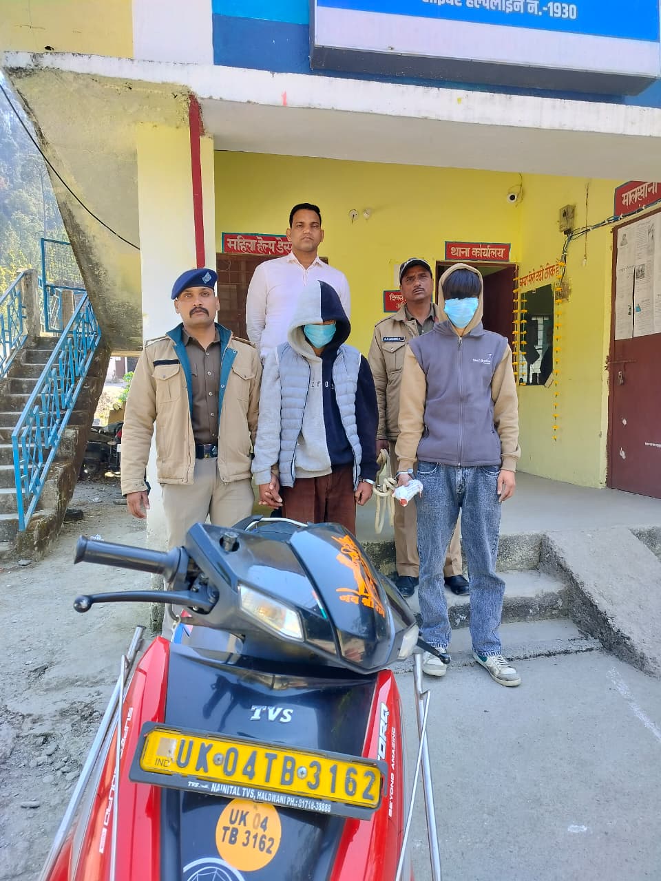चेकिंग के दौरान सिमलिया बैण्ड से करीब एक किलोमीटर नीचे खनस्यूँ-हल्द्वानी मार्ग पर लाल-काले रंग की स्कूटी (यूके04टीबी-3162, टीवीएस एन्टॉर्क) सवार दो युवक पुलिस को देखकर भागने लगे, जिन्हें घेराबंदी कर पकड़ लिया गया। तलाशी में स्कूटी की डिग्गी से 202 ग्राम अवैध चरस बरामद हुई।