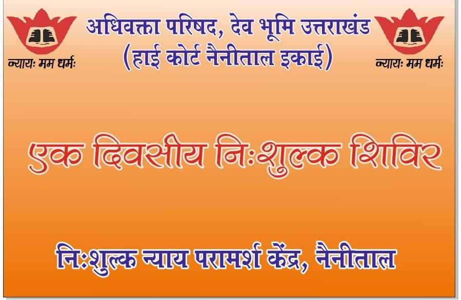 नैनीताल:::- अधिवक्ता परिषद देवभूमि उत्तराखंड हाई कोर्ट (इकाई) नैनीताल द्वारा दशहरा पर्व के उपलक्ष्य में 2 नवंबर को एक दिवसीय निःशुल्क कानूनी शिविर का आयोजन किया जाएगा। यह शिविर प्रातः 11 बजे से शाम 4 बजे तक नैनीताल के डीएसए फील्ड गुरुद्वारा के पास आयोजित होगा।