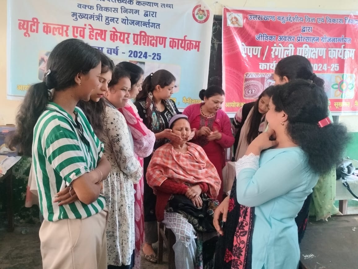 नैनीताल :::- नैनी महिला एवं बाल विकास समिति सूखाताल द्वारा उत्तराखंड अल्पसंख्यक कल्याण तथा वक्फ विकास निगम के सहयोग से 3 माह का ब्यूटी कल्चर एवं हेल्थ केयर प्रशिक्षण संचालित किया जा रहा है। यह प्रशिक्षण निर्मला चन्द्रा द्वारा दिया जा रहा है जिसमें प्रशिक्षणार्थियों को थ्रेडिंग, हेयर कटिंग,हेयर स्टाइल, मेहंदी लगाना ,ब्राइडल मेकअप,लाइट मेकअप,फेशियल, मैनीक्योर,पैडीक्योर, दुल्हन सजना ,साड़ी बांधना, आदि का प्रशिक्षण दिया गया, साथ ही सौंदर्य शिक्षा व स्वस्थ रहने ,त्वचा की देखभाल के लिए पोषाहार व विभिन्न विटामिन आदि की भी जानकारी दी गई। संस्था की अध्यक्ष शैलजा सक्सेना ने बताया कि आज के समय में ब्यूटी पार्लर का बहुत अधिक चलन है यह रोजगार का बहुत अच्छा माध्यम है प्रशिक्षण प्राप्त कर महिलाएं, युवतियां स्वरोजगार अपना सकती है तथा स्वयं का ब्यूटी पार्लर भी खोल कर आत्मनिर्भर बन सकती है। उन्होंने बताया कि प्रशिक्षण लगभग पूर्ण हो रहा है अत: सभी प्रशिक्षार्थियों को स्वरोजागार अवश्य अपना चाहिए, इसी उद्देश्य से उत्तराखंड अल्पसंख्यक कल्याण तथा वक्फ विकास निगम द्वारा प्रशिक्षण दिया गया है। यह प्रशिक्षण ऐशडेल कन्या इंटर कालेज सूखताल में चलाया जा रहा है। इस दौरान रहीसा चिश्ती, रुखसाना खान, निखत, हुमा सिद्दीकी,फौजिया, तबस्सुम खान, साहिबा, रिजवाना खान, तरन्नुम, सिमरन, हिना स्वालेहा समेत अन्य लोग रहें।