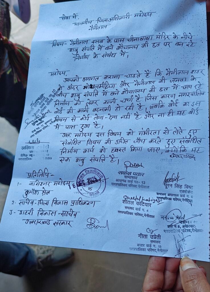 नैनीताल:::- नैनीताल क्लब के समीप चीना बाबा मंदिर के नीचे स्थित शत्रु संपत्ति में बने शौचालय की छत पर हो रहे निर्माण को लेकर नगर पालिका परिषद के सभासदों ने मंगलवार को जिलाधिकारी ललित मोहन रयाल को पत्र सौंपा। सभासदों ने मामले को गंभीर बताते हुए संबंधित निर्माण कार्य की जांच कर उसे ध्वस्त करने की मांग की है।