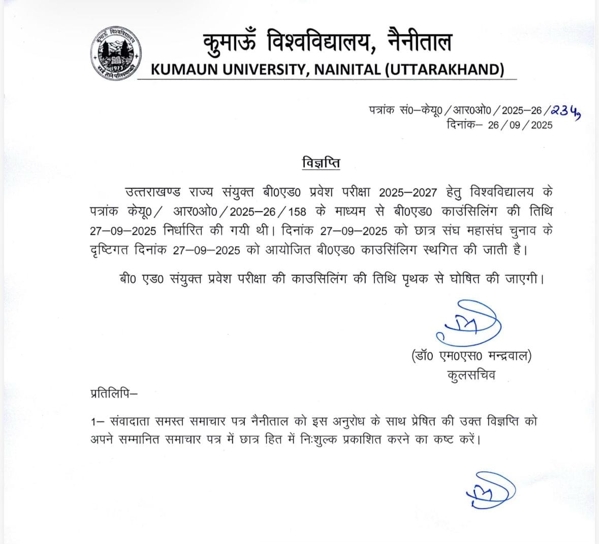 नैनीताल :::- कुमाऊँ विश्वविद्यालय द्वारा जारी विज्ञप्ति के अनुसार उत्तराखण्ड राज्य संयुक्त बी.एड. प्रवेश परीक्षा 2025–2027 के लिए निर्धारित 27 सितंबर की बी.एड. काउंसलिंग स्थगित कर दी गई है।