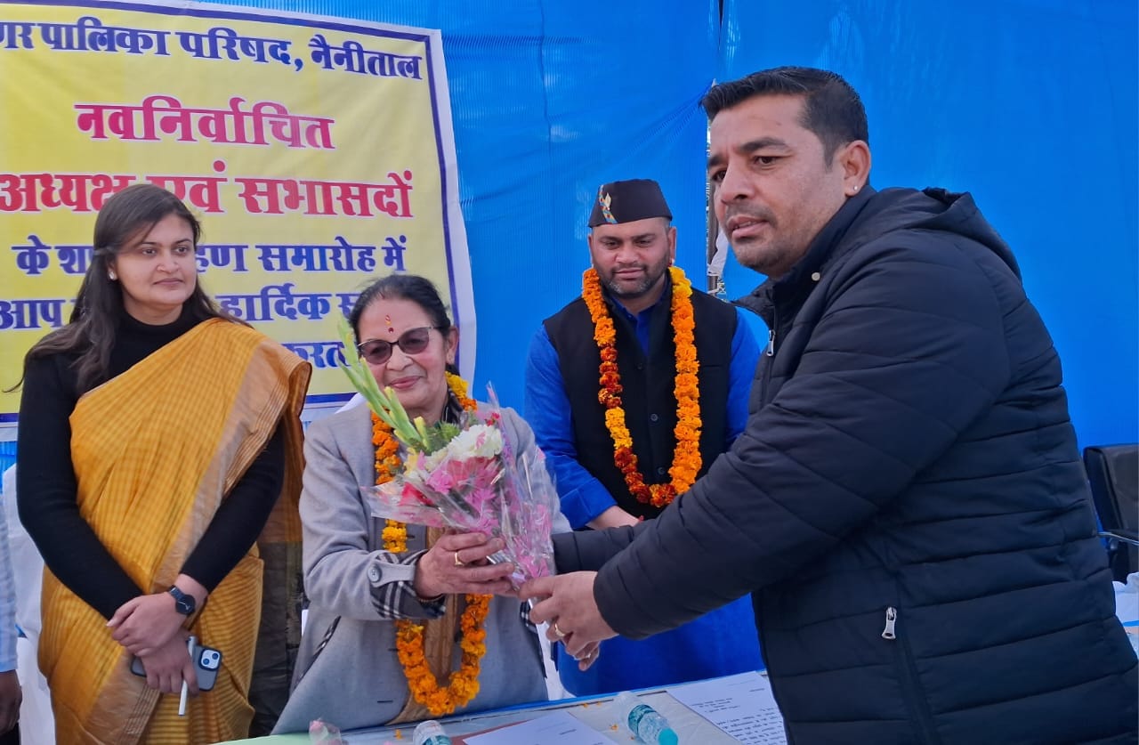 नैनीताल:::- नगर पालिका परिषद के अध्यक्ष व सभासद को शुक्रवार को शपथ ग्रहण कार्यक्रम का आयोजन किया गया । संयुक्त मजिस्ट्रेट वरुणा अग्रवाल ने डीएसए मैदान में स्थित बास्केटबॉल कोर्ट में नवनिर्वाचित पालिकाध्यक्ष डॉ. सरस्वती खेतवाल समेत नवनिर्वाचित सभी 15 वार्डों के सभासदों को शपथ दिलाई।
