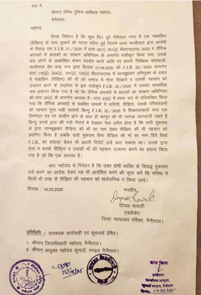 नैनीताल:::- मल्लीताल कोतवाल की कार्यप्रणाली पर गंभीर सवाल खड़े हो गए हैं जिला बार एसोसिएशन के सचिव ने बुधवार को वरिष्ठ पुलिस अधीक्षक (एसएसपी) को पत्र भेजकर मल्लीताल कोतवाल के खिलाफ एफआईआर दर्ज करने की मांग की है पत्र में आरोप लगाया गया है कि कोतवाल ने एक नाबालिग के परिजनों की पहचान उजागर कर “लैंगिक अपराधों से बालकों का संरक्षण अधिनियम” (पोक्सो एक्ट) का उल्लंघन किया है बार एसोसिएशन के सचिव दीपक रुवाली ने पत्र में लिखा है कि कोतवाल ने अभियुक्त के दबाव में आकर पीड़िता की मां का नाम एफआईआर में जानबूझकर उजागर किया जिससे की समाज में उन्हें अपमानित किया जा सके उन्होंने यह भी कहा कि कानूनन पीड़िता और उसके परिवार की पहचान गोपनीय रखना अनिवार्य है और मां का नाम सार्वजनिक करने से पीड़िता की पहचान स्वतः स्पष्ट हो जाती है, जो कि पोक्सो के तहत एक गंभीर अपराध है कहा की जिस पुलिस विभाग कर्तव्य समाज व कानून में न्याय बनाना है वहीं जब संवेदनशील कानूनों की अनदेखी करता दिखे तो चिंता और भी गहरी हो जाती है कहा की पीड़ित के न्याय के लिए पुलिस प्रशासन कितना गम्भीर है इस बात पर प्रश्न चिन्ह उठता है कहा कि यह न केवल प्रशासनिक दृष्टि से गंभीर अपराध है बल्कि नैतिक व संवैधानिक दृष्टि से भी अत्यंत चिंतापूर्ण है पत्र में इस कृत्य को जानबूझकर किया गया गंभीर उल्लंघन बताते हुवे मल्लीताल कोतवाल के खिलाफ तत्काल कार्रवाई की मांग की गई है मामले की गंभीरता को देखते हुए पत्र की प्रतिलिपि कुमाऊं आयुक्त और जिलाधिकारी को भी भेजी गई है।