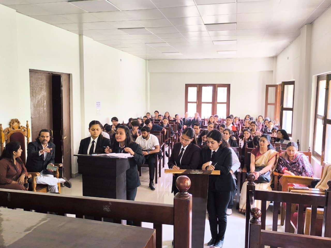कार्यक्रम की अध्यक्षता विभागाध्यक्ष डॉ. सुरेश चन्द्र पाण्डेय ने की तथा समन्वयक डॉ. सागर सिंह पाटनी रहे। संचालन डॉ. राशि मिगलानी ने किया। मूट विचारण में अभियोजन पक्ष से यशिता करगेती, जया बहुगुणा और प्रतिरक्षा पक्ष से निधि हरड़िया व कशिश पाण्डेय ने अपनी प्रस्तुति दी।
