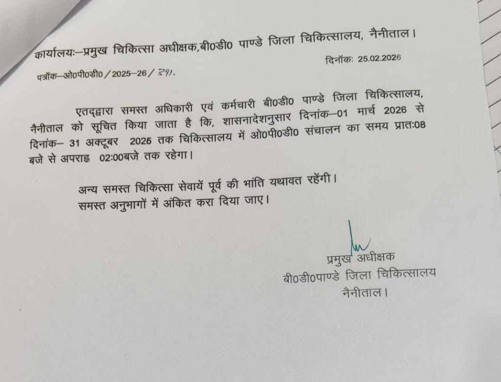 नैनीताल:::- गर्मी शुरू होने के साथ ही बीडी पांडे अस्पताल में ओपीडी का समय भी बदल दिया गया है। अब अस्पताल में डॉक्टर 01 मार्च सुबह 8 बजे से दोपहर 2 बजे तक ओपीडी में मरीजों को देखेंगे। रविवार से नया टाइम टेबल लागू हो गया है।