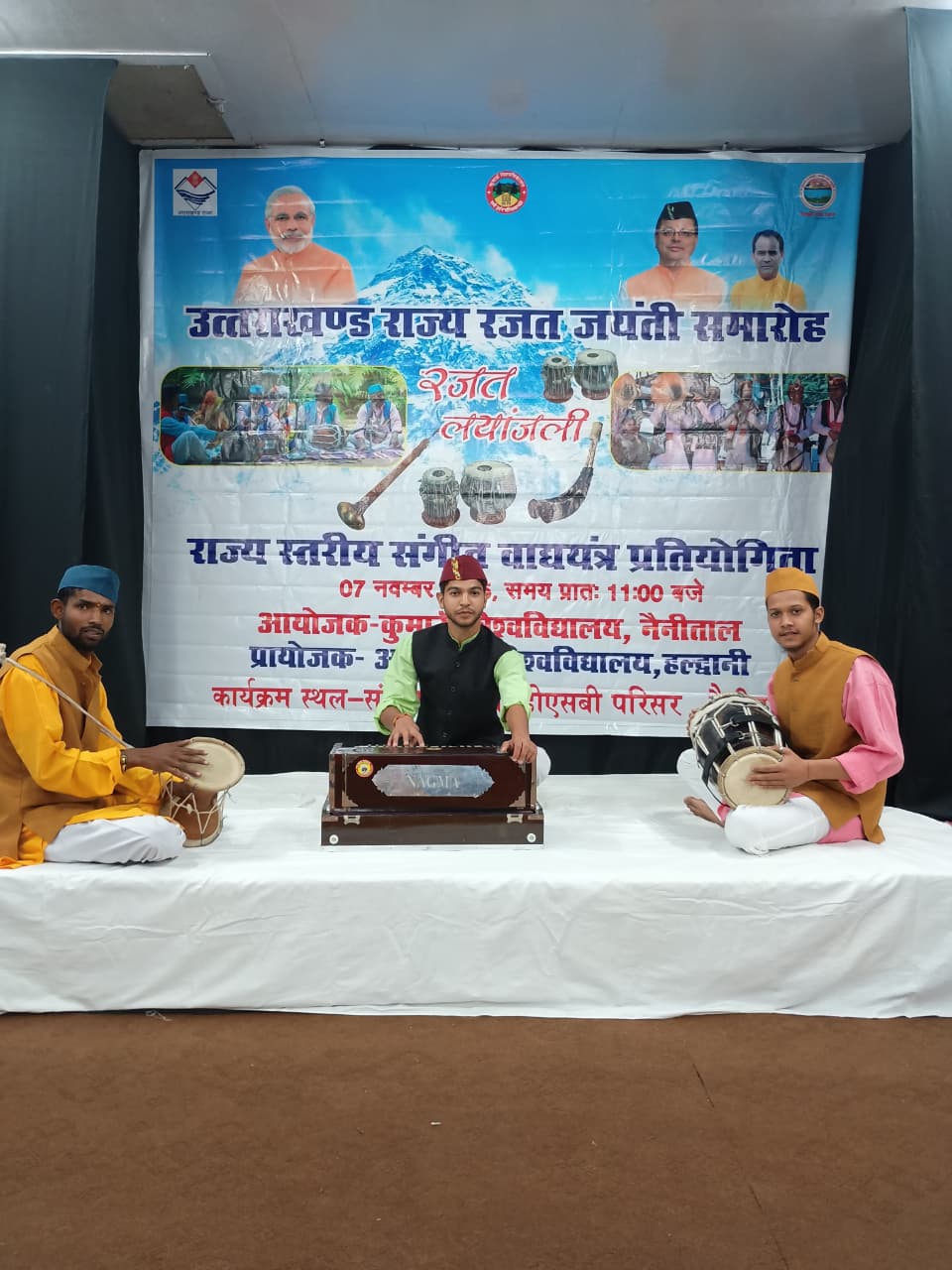 नैनीताल:::- उत्तराखंड राज्य स्थापना दिवस की रजत जयंती के उपलक्ष्य में शुक्रवार को कुमाऊँ विश्वविद्यालय में राज्य स्तरीय वाद्य यंत्र प्रतियोगिता का आयोजन किया गया। प्रतियोगिता में प्रदेशभर के विभिन्न विश्वविद्यालयों के विद्यार्थियों ने भाग लिया