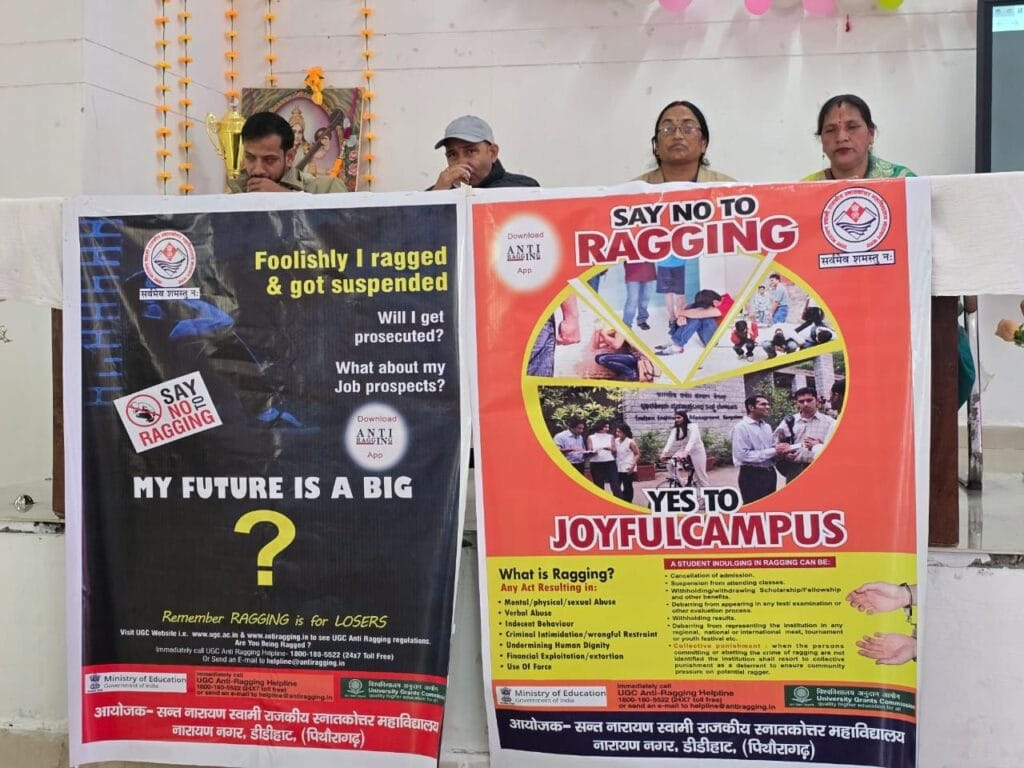 पिथौरागढ़:::-  उच्च शिक्षा निदेशालय देहरादून के निर्देशानुसार संत नारायण स्वामी राजकीय स्नातकोत्तर महाविद्यालय नारायण नगर में एंटी रैगिंग जन-जागरूकता का आयोजन शुक्रवार को किया गया। कार्यक्रम की अध्यक्षता प्राचार्य प्रो. प्रेमलता कुमारी ने की,प्राचार्य ने  कहा कि ऐसे कार्यक्रम विद्यार्थियों में जागरूकता, अनुशासन एवं संवेदनशीलता की भावना को सशक्त बनाते हैं। रैगिंग एक गंभीर सामाजिक एवं कानूनी अपराध है, अतः विद्यार्थियों को अनुशासन, सहयोग और सम्मान की भावना के साथ महाविद्यालय में सकारात्मक वातावरण बनाए रखना चाहिए।